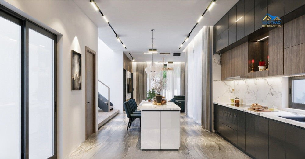 Khi bước vào ngôi biệt thự, người ta không thể không chú ý đến sự tinh tế trong từng chi tiết thiết kế. Mặt tiền được bố trí một cách hài hòa, nổi bật với sự kết hợp hài hòa giữa kính và các vật liệu công nghệ mới, tạo nên vẻ đẹp hiện đại và sang trọng. Bên trong, không gian mở rộng lớn kết hợp với hệ thống cửa kính lớn mở ra tạo cảm giác thoáng đãng và góc nhìn bao quát. Phòng khách và phòng bếp được thiết kế theo phong cách mở, tận dụng tối đa ánh sáng tự nhiên và không gian để tạo nên không gian sống linh hoạt và tiện dụng.