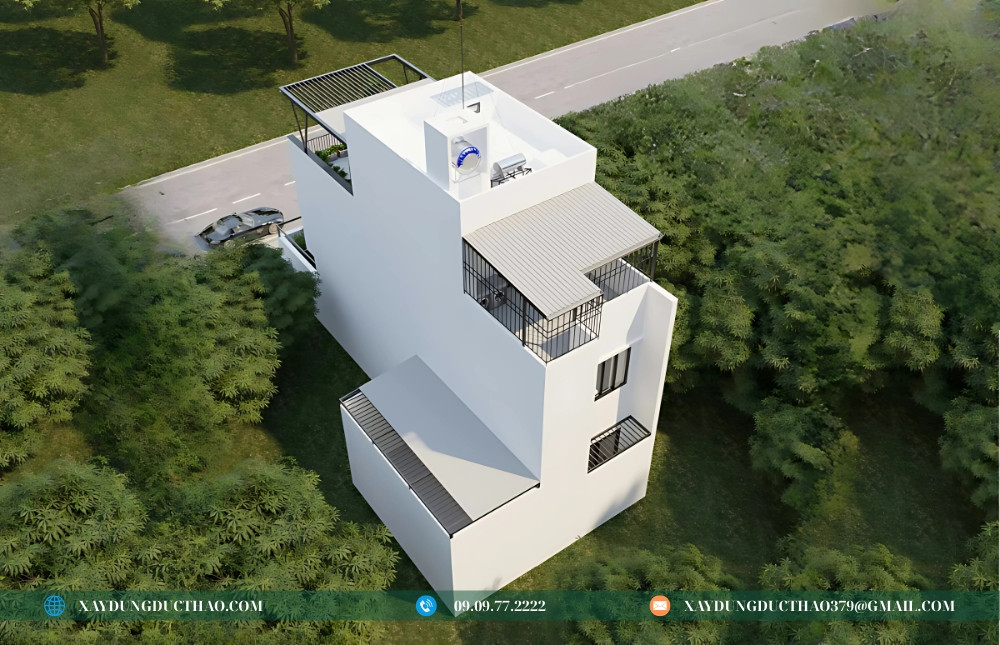 Cuối cùng là Tầng 3, không gian mang ý nghĩa tâm linh và tiện ích đa năng. Phòng thờ được bố trí ở vị trí trang nghiêm và yên tĩnh nhất, thể hiện sự tôn kính và gìn giữ nét đẹp văn hóa truyền thống của gia đình Việt. Phía trước là sân thượng rộng rãi, một không gian mở lý tưởng cho nhiều mục đích sử dụng: từ khu vực giặt phơi tiện lợi, đến nơi tập thể dục buổi sáng trong lành hay tổ chức những buổi tiệc BBQ ấm cúng cùng bạn bè và người thân. Tương tự như tầng 2, ban công tầng 3 tiếp tục mở ra một không gian thoáng đãng, giúp ngôi nhà luôn mát mẻ và đón gió, tạo sự lưu thông không khí tuyệt vời.